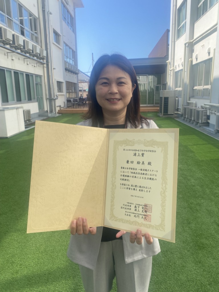 第14回日本認知症予防学会学術集会において、本学部兼田絵美助教が「浦上賞」を受賞しました。浦上賞は、一般演題発表の中から特に優れた発表に対して授与される名誉ある賞です。タイトル:「地域在住高齢者における介護経験の有無による生活機能の比較検討」